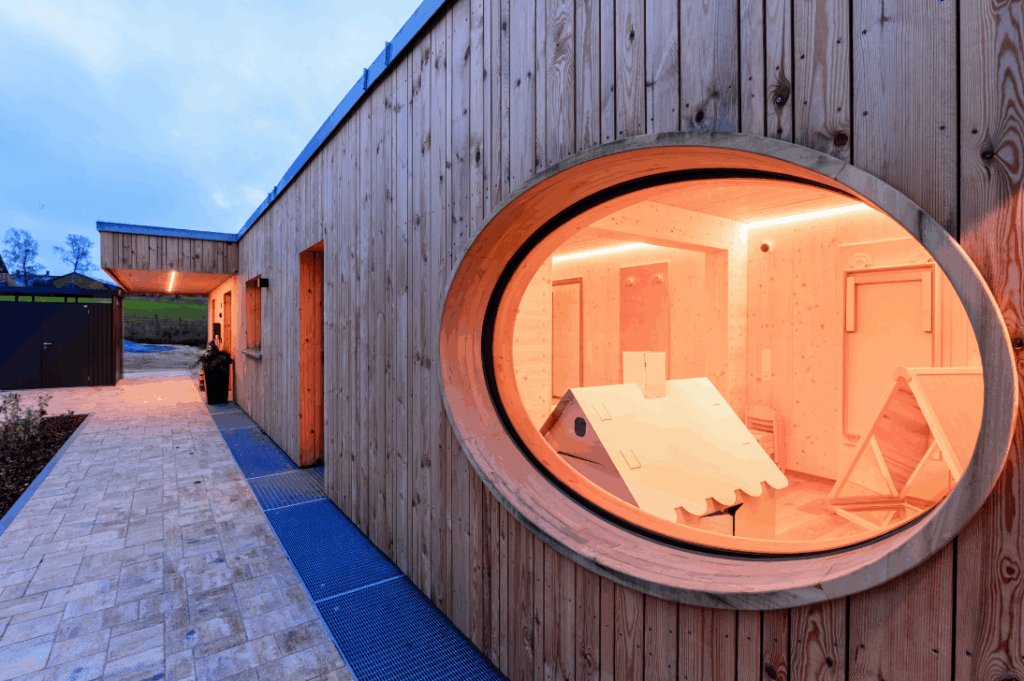 Im Sommer 2024 hatte das Warten ein Ende – unsere Kinderkrippe „Schachtlwichtl“ wurde angeliefert. Das Modulhaus aus Holz wurde aus 6 Einzelmodulen zusammengesetzt und konnte so innerhalb weniger Stunden vollständig aufgebaut werden. Im September 2024 öffnete die Kinderkrippe für 12 Wichtl dann seine Türen und betreut seitdem nach dem Konzept des Learning Campus die Kinder.